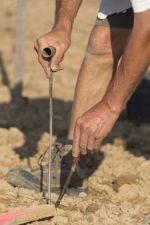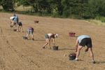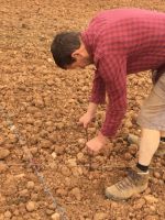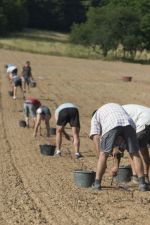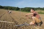 Près de 7000 greffes de chardonnay blanc ont été plantées à la main, « au cordeau » c’est à dire que chaque petite greffe est à la même distance des autres. Le travail, moins rude que celui de l’arrachage des racines, est à main d’homme et demande beaucoup de concentration. Une équipe photographiée par Serge Sang par cette belle journée de juin.